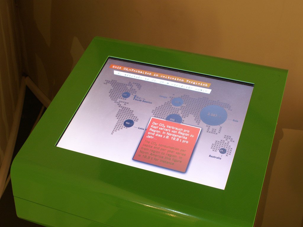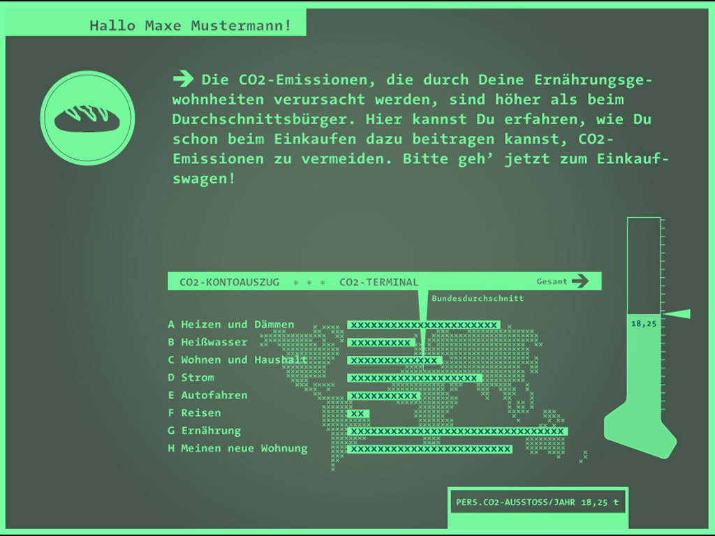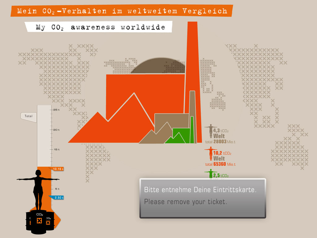 Im Team von 10 Mitarbeiten entwickelte alphadock ein Jahr lang die mediale Technik, das UX und die Hardware-Ansteuerung aller Exponate im Bereich CO2-Fußabdruck sowie die CO2-Terminals und die Kartenleser. Der Besucher „erspielt“ sich an einzelnen Stationen seinen individuellen Score und kann sich zum Schluss seinen CO2-Fußabdruck ausdrucken lassen.